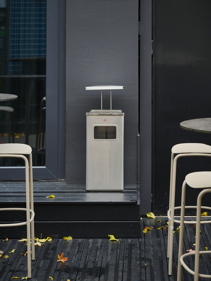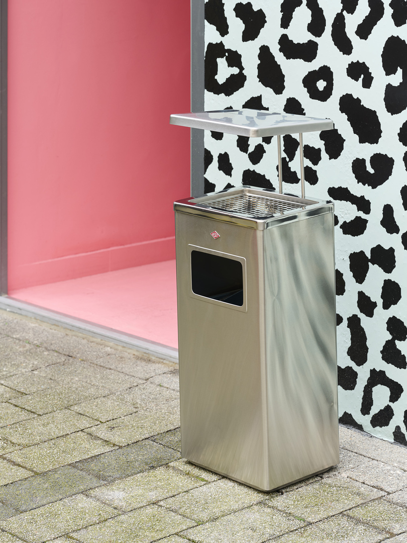 Standascher aus Edelstahl. Der Aschereinsatz oben kann zur Reinigung entnommen werden. Sieb und Aschereinsatz sind ebenfalls aus Edelstahl. Der Abfallsammler unten hat einen verzinkten Einsatz mit einem Volumen von 19 Litern. Wetterfest.