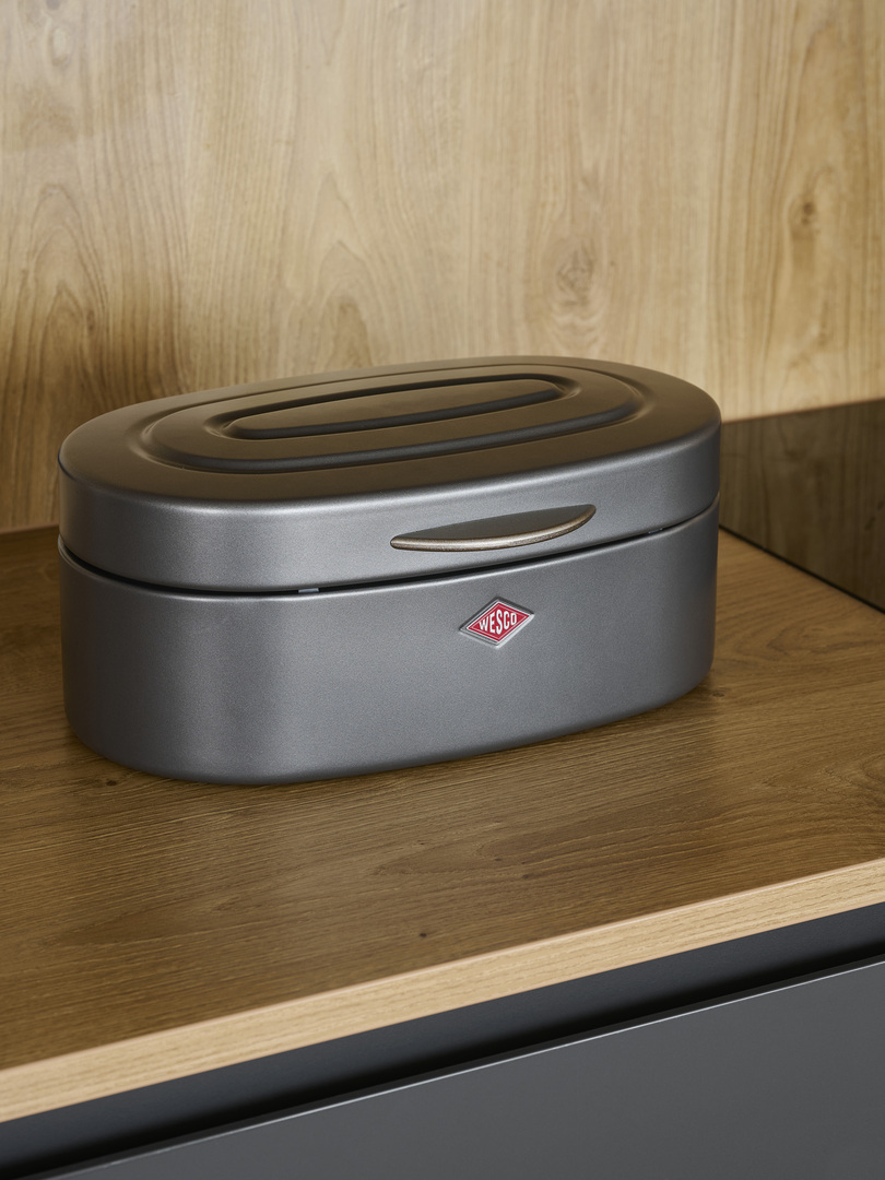 Einfach schön. Der Brotkasten Single Elly ist ein echtes Retro-Schmuckstück, denn mit seiner ovalen Form und der dekorativen Prägung im Deckel erinnert er an Brotkästen aus den 50er Jahren. Die Brotbox ist besonders für kleinere Haushalte gut geeignet, da sie mit einer Standfläche von 32 x 19 cm nicht viel Raum auf der Arbeitsplatte einnimmt. In der Single Elly lassen sich Brot, Brötchen, Gebäck oder Kuchen hygienisch aufbewahren. Lüftungslöcher auf der Rückseite der Brotdose sorgen für eine gute Luftzirkulation.