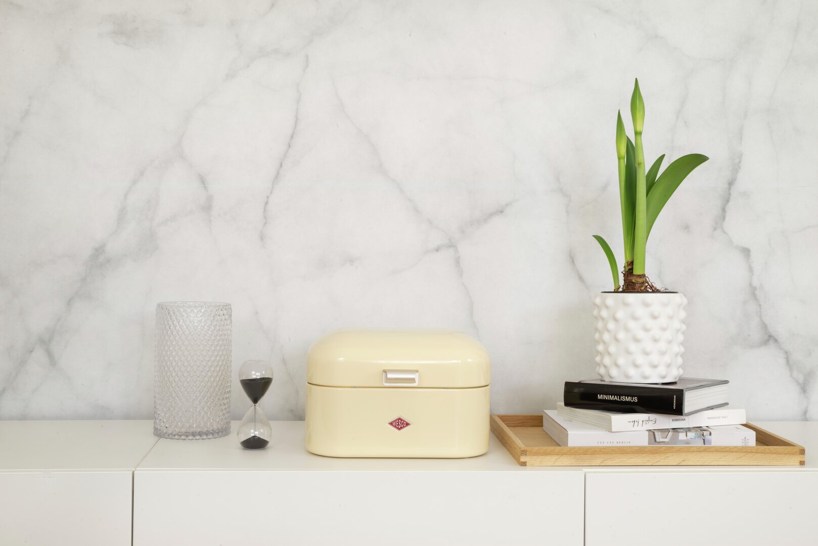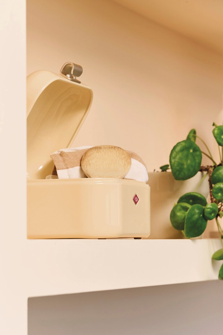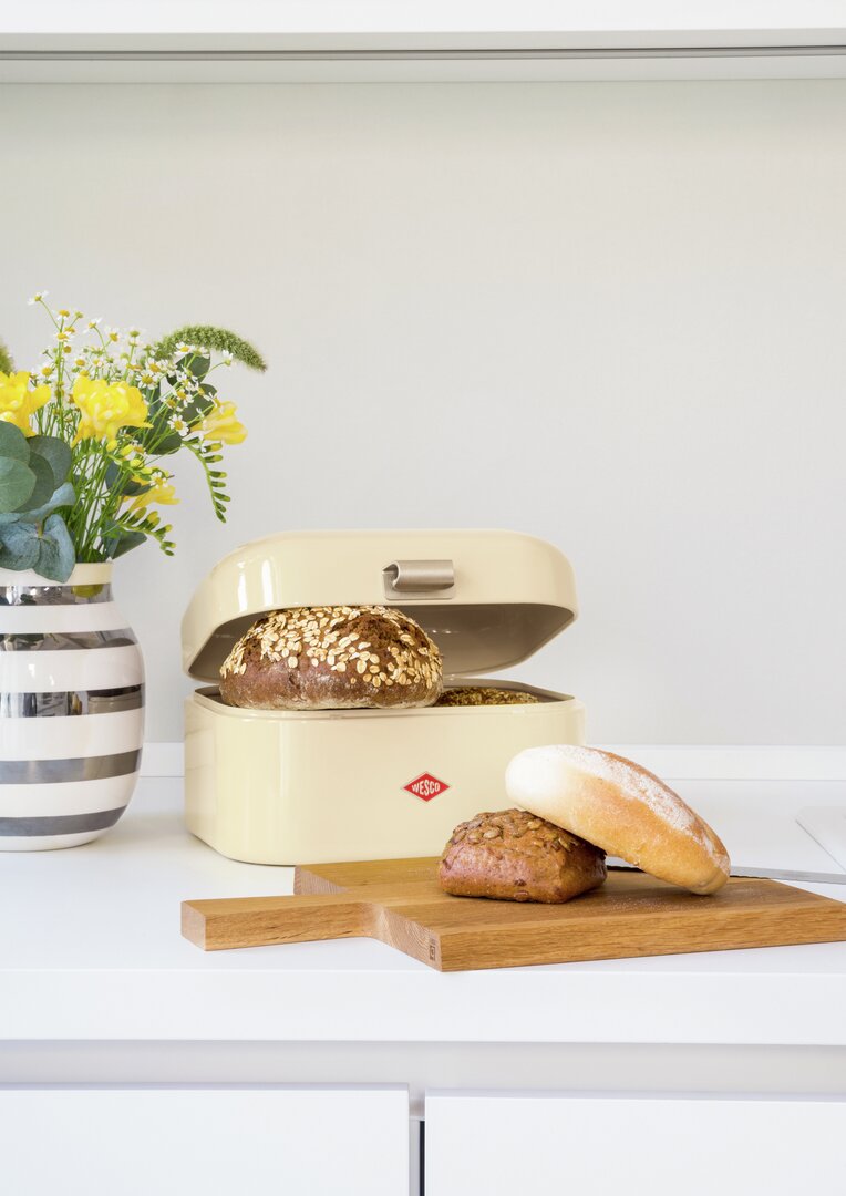 Gar kein Problem. Der Brotkasten Single Grandy® ist dank seiner Größe super für Küchen geeignet, in denen nicht viel Platz ist. In ihm kann ein kleineres Brot genauso gut hygienisch aufgehoben werden wie Brötchen, Gebäck oder Kuchen.Die Lüftungslöcher auf der Rückseite sorgen für eine optimale Luftzirkulation. So bleibt der Inhalt im Brotkasten länger frisch. Der Deckel ist mit stabilen Metallscharnieren am Unterteil befestigt.