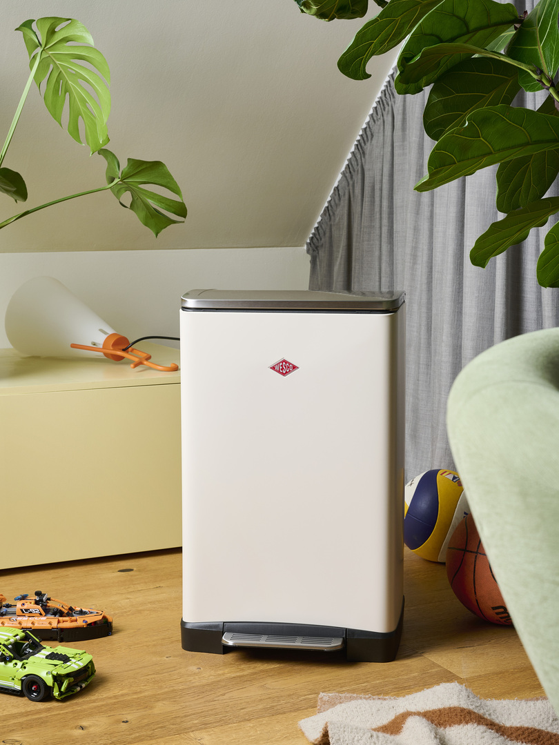The pedal bin has two separate 18-litre inserts that you can fill as required with recyclables, paper, plastic or organic waste. The stainless steel lid closes almost silently thanks to a built-in damper and seals the waste securely. The lid can also be locked in the open position. A practical attachment option for bin bags on the plastic inserts prevents the bag from slipping out so that nothing can spill. The generous stainless steel foot pedal guarantees easy operation and free hands for convenient waste disposal. The Big Double Boy is a great waste separation system with a stylish look.