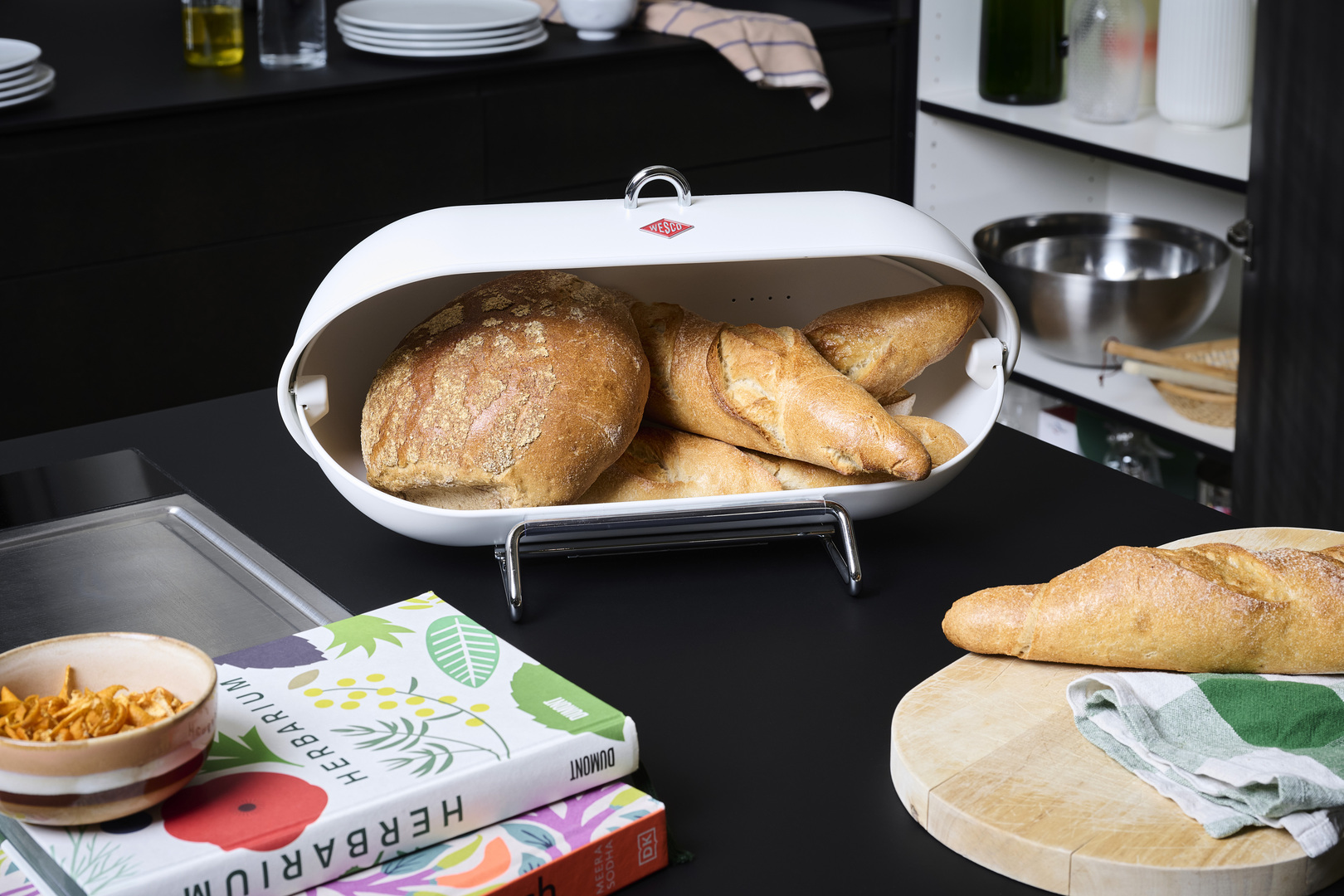 A true classic in proven WESCO quality. The Breadboy is made from two half-shells, the upper of which swings backwards when opened to reveal a generous opening. Ventilation holes at the back ensure optimum air circulation. This keeps bread etc. fresh for longer.