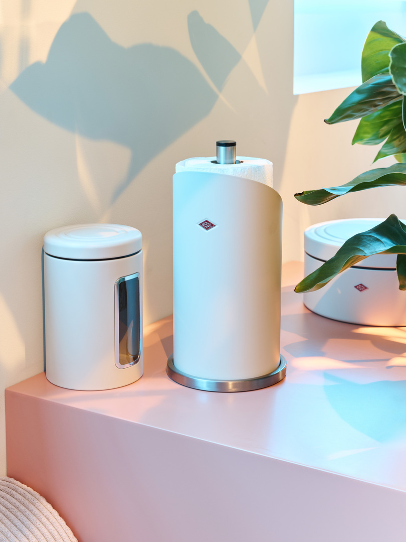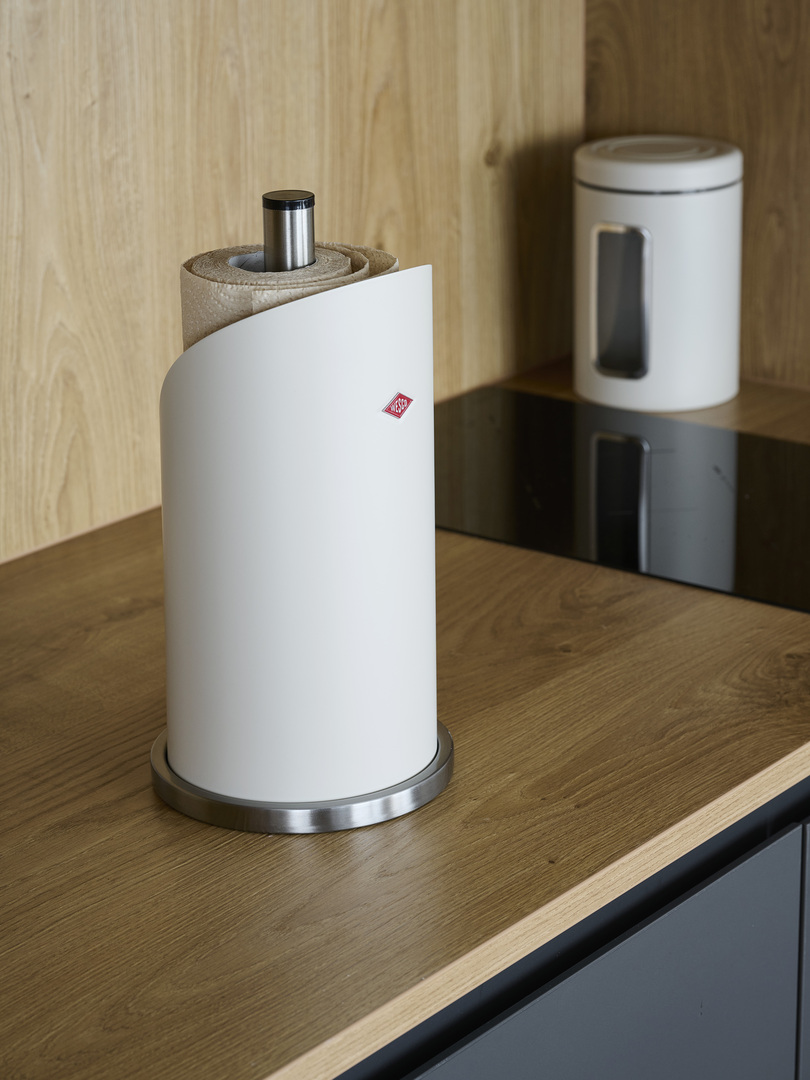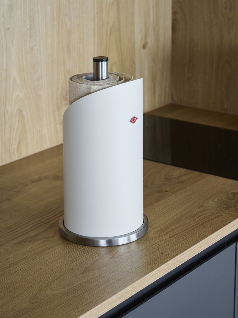 Does your kitchen roll not yet have a permanent place in your kitchen? Then it's high time for this practical roll holder in the typical Wesco material mix of stainless steel and coloured lacquered sheet steel.
